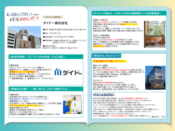働きやすい環境づくりとして、2024年に「DAIDO cadeau building」を新設し、モノづくりの技術を未来へつなぐに相応しい環境が整いました。また、完全週休2日制+祝日休み、社宅制度など充実した福利厚生も魅力です。